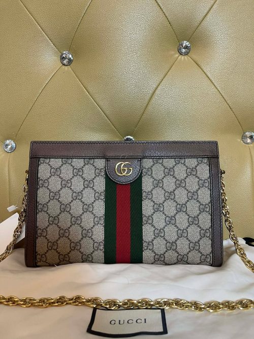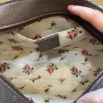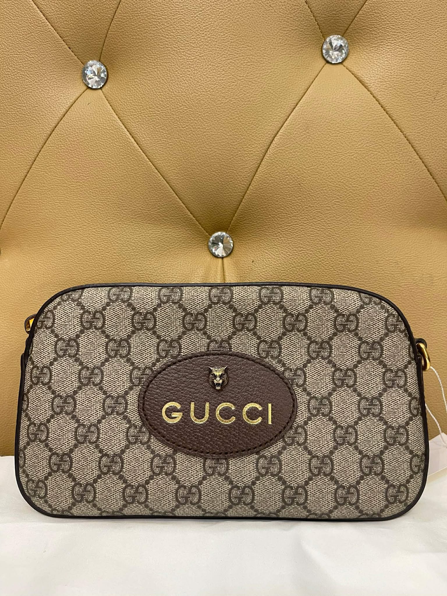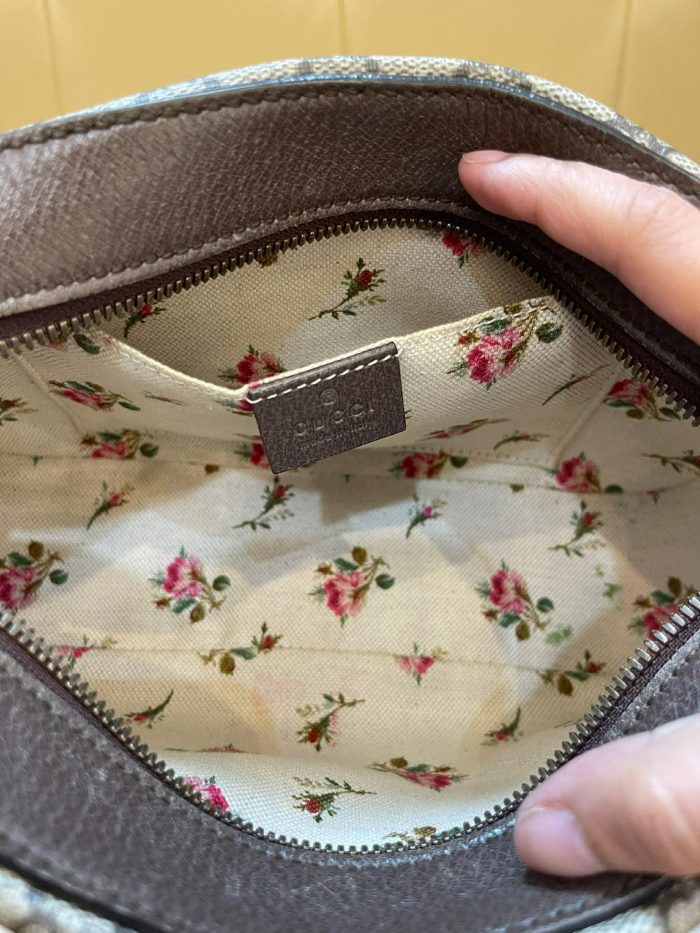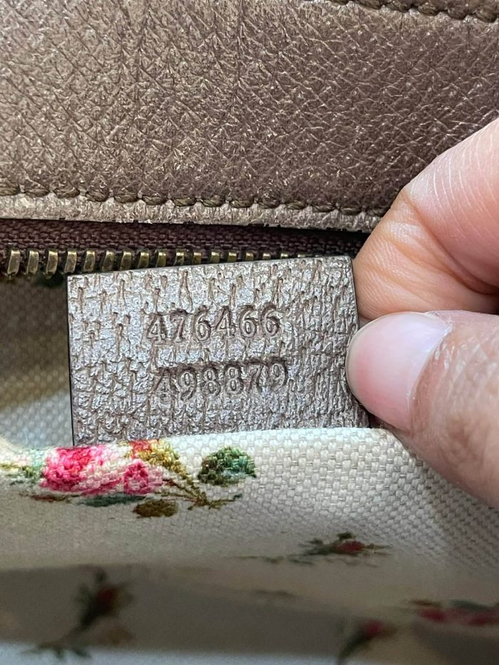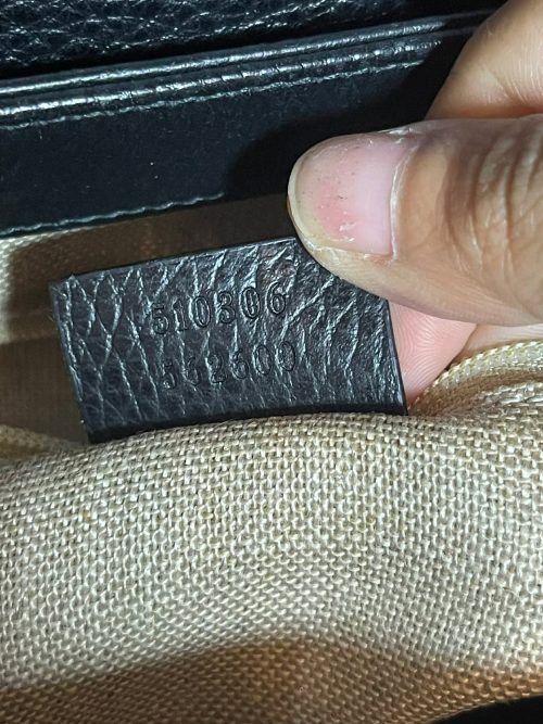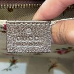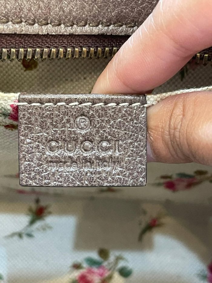 Logo: Leather tag with Gucci branding and antique gold-tone hardware.