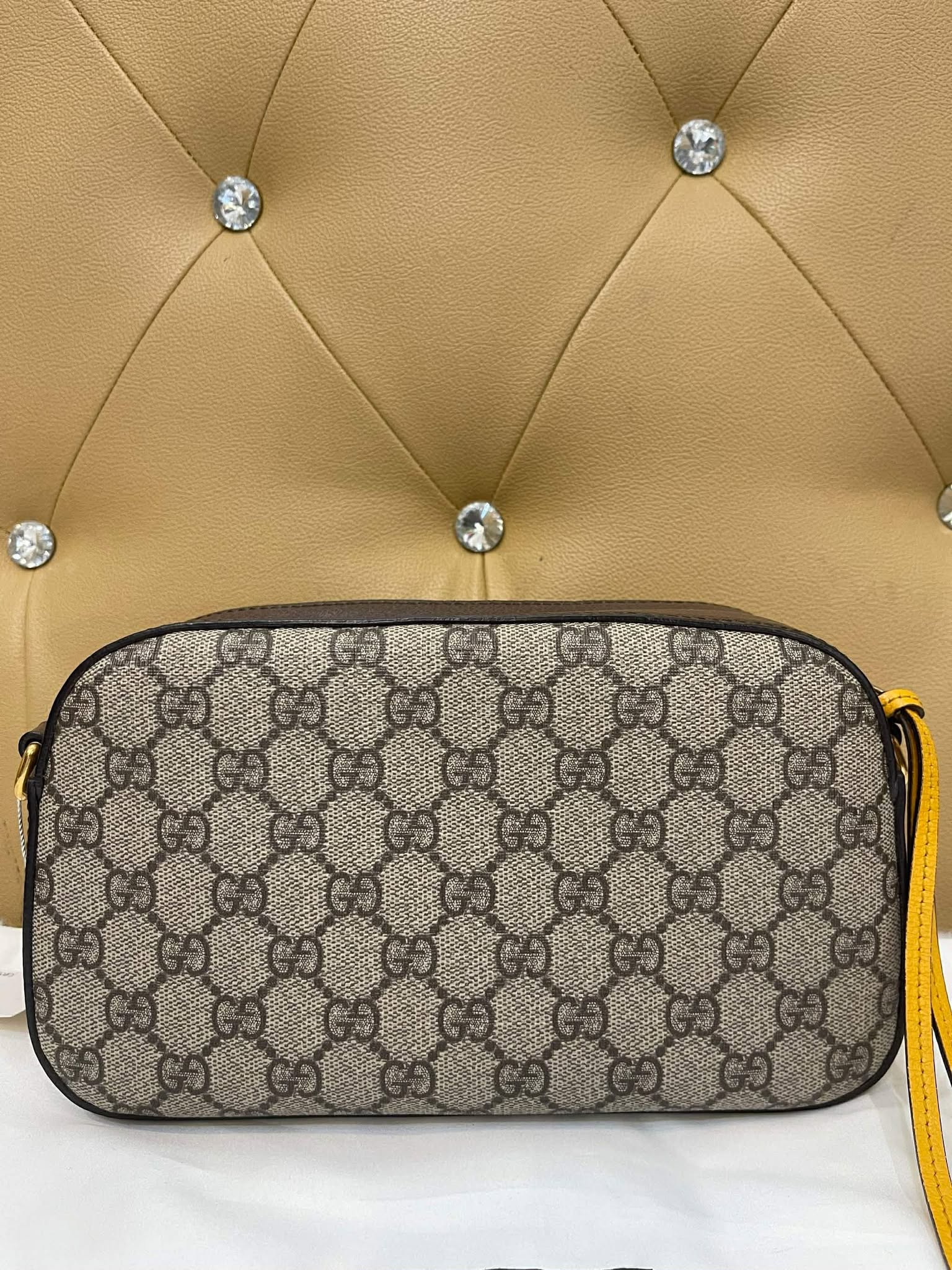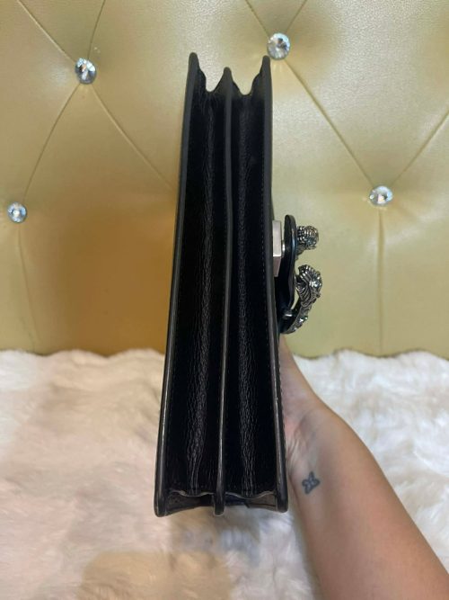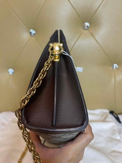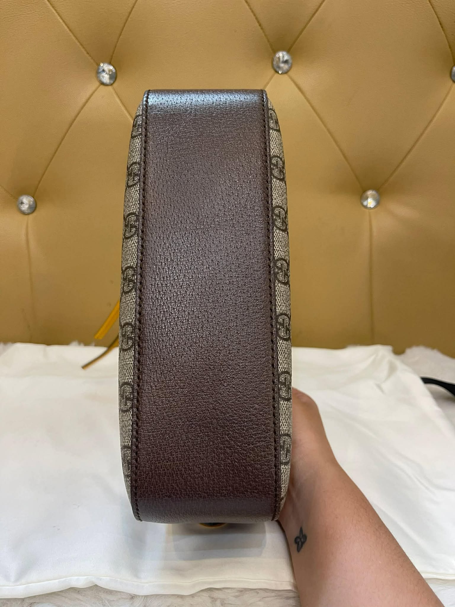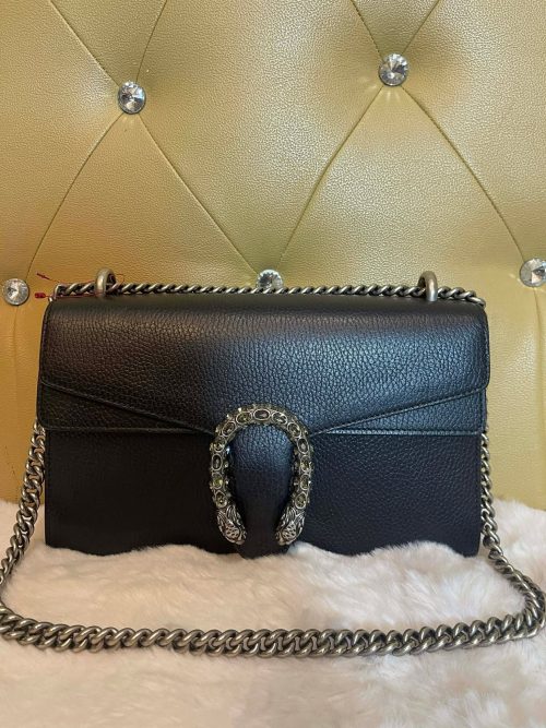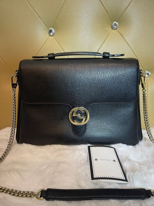 Logo: Leather tag with Gucci branding and antique gold-tone hardware.