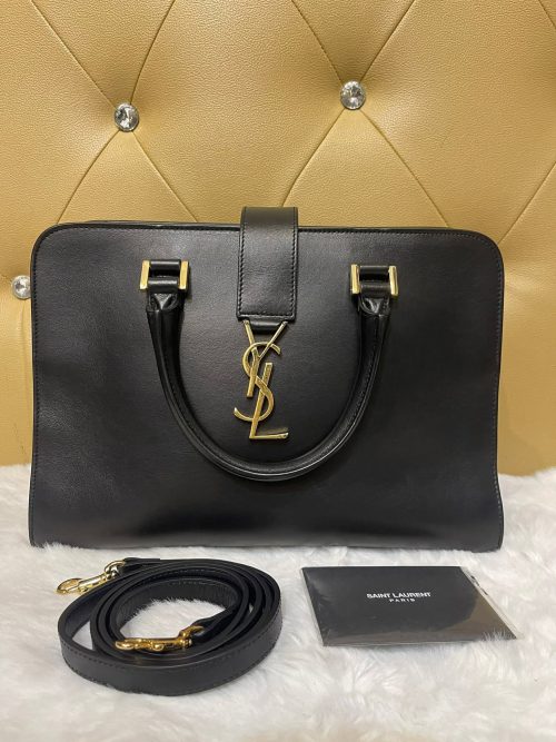Logo: Oversized Cassandre YSL monogram in gold-tone hardware on the front flap.