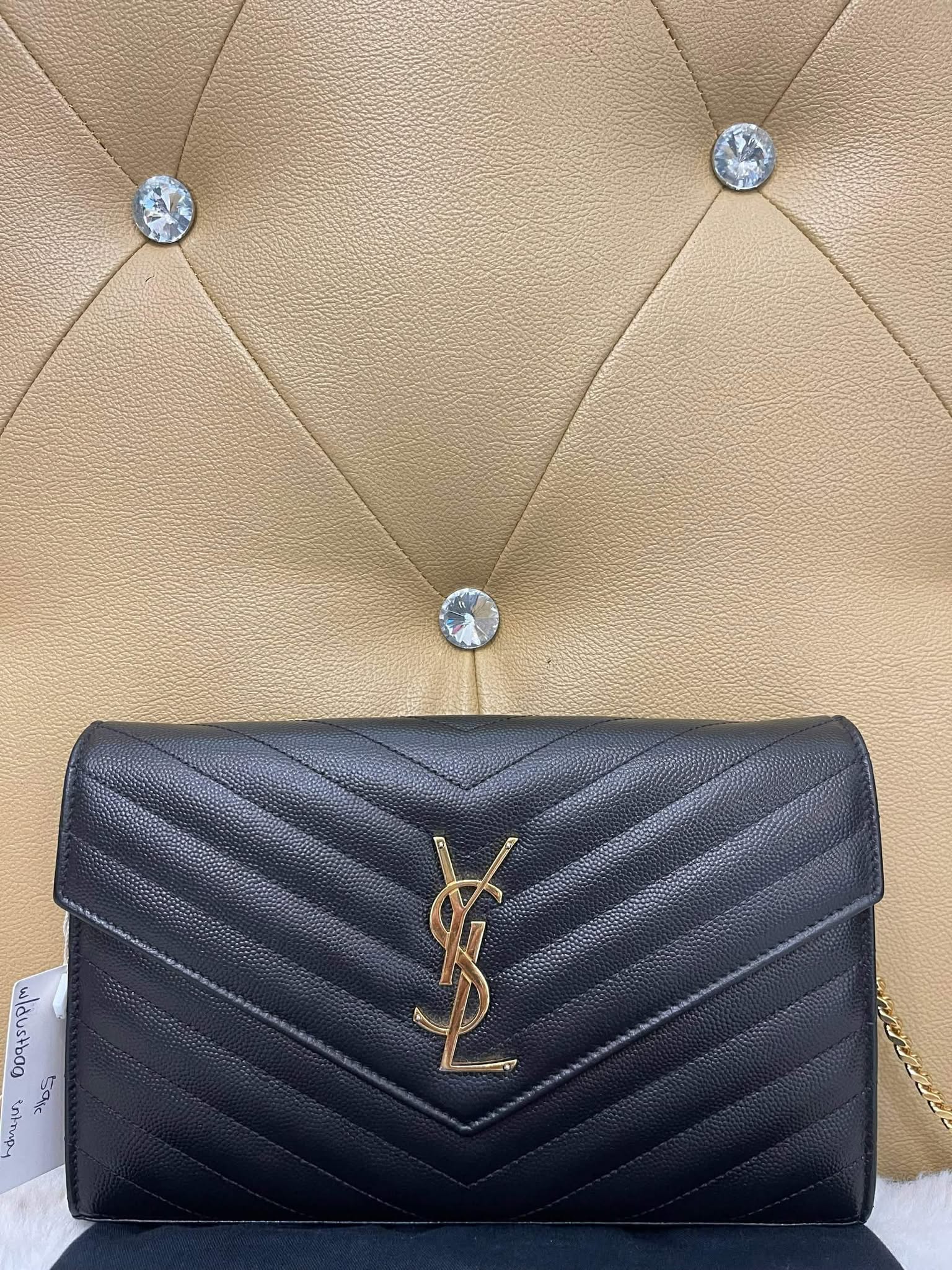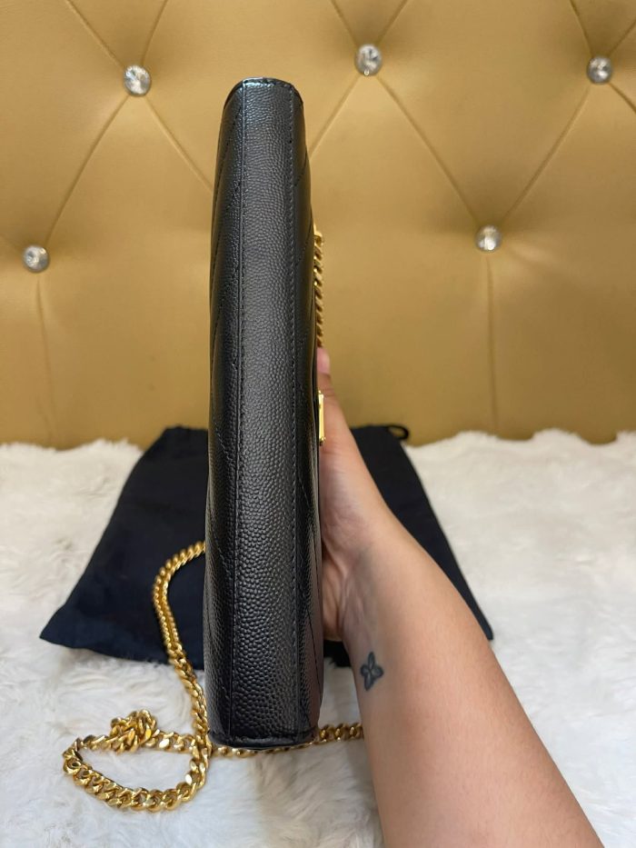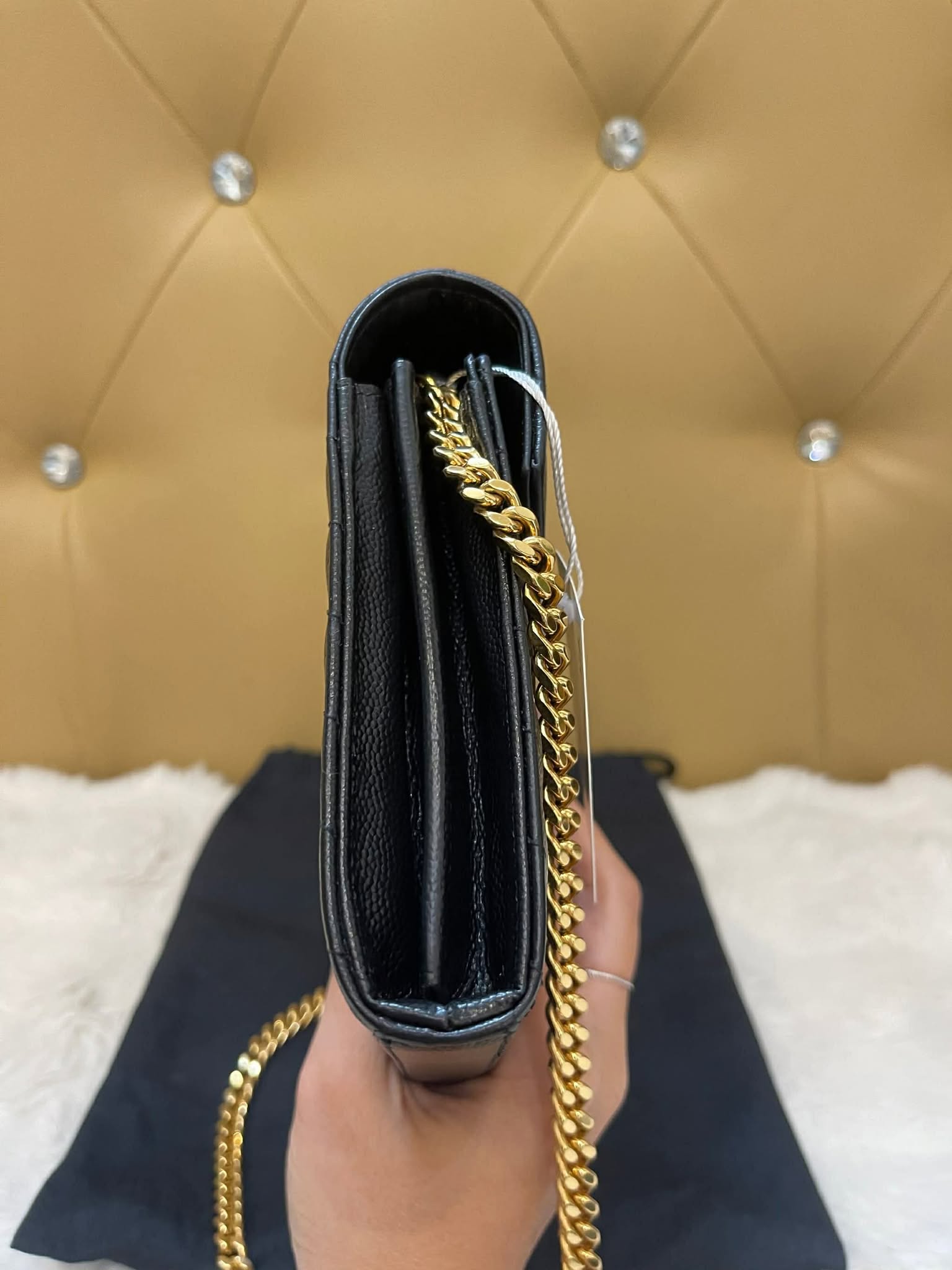 The Saint Laurent Cassandre Wallet on Chain (WOC) in Gold-Tone Hardware is one of YSL’s most iconic evening bags, combining sleek Parisian design with practical versatility. It’s essentially a wallet-sized clutch with a detachable chain strap, making it perfect for both day-to-night transitions.