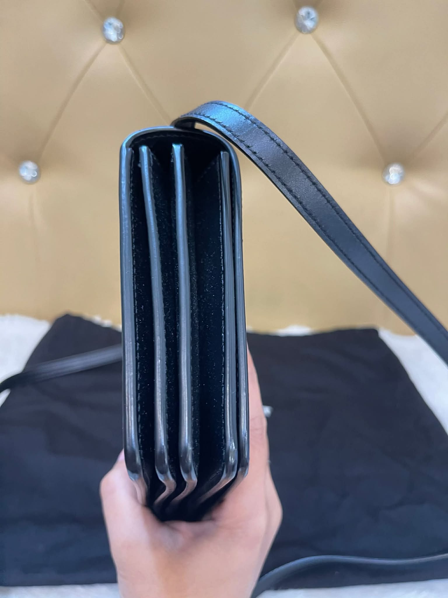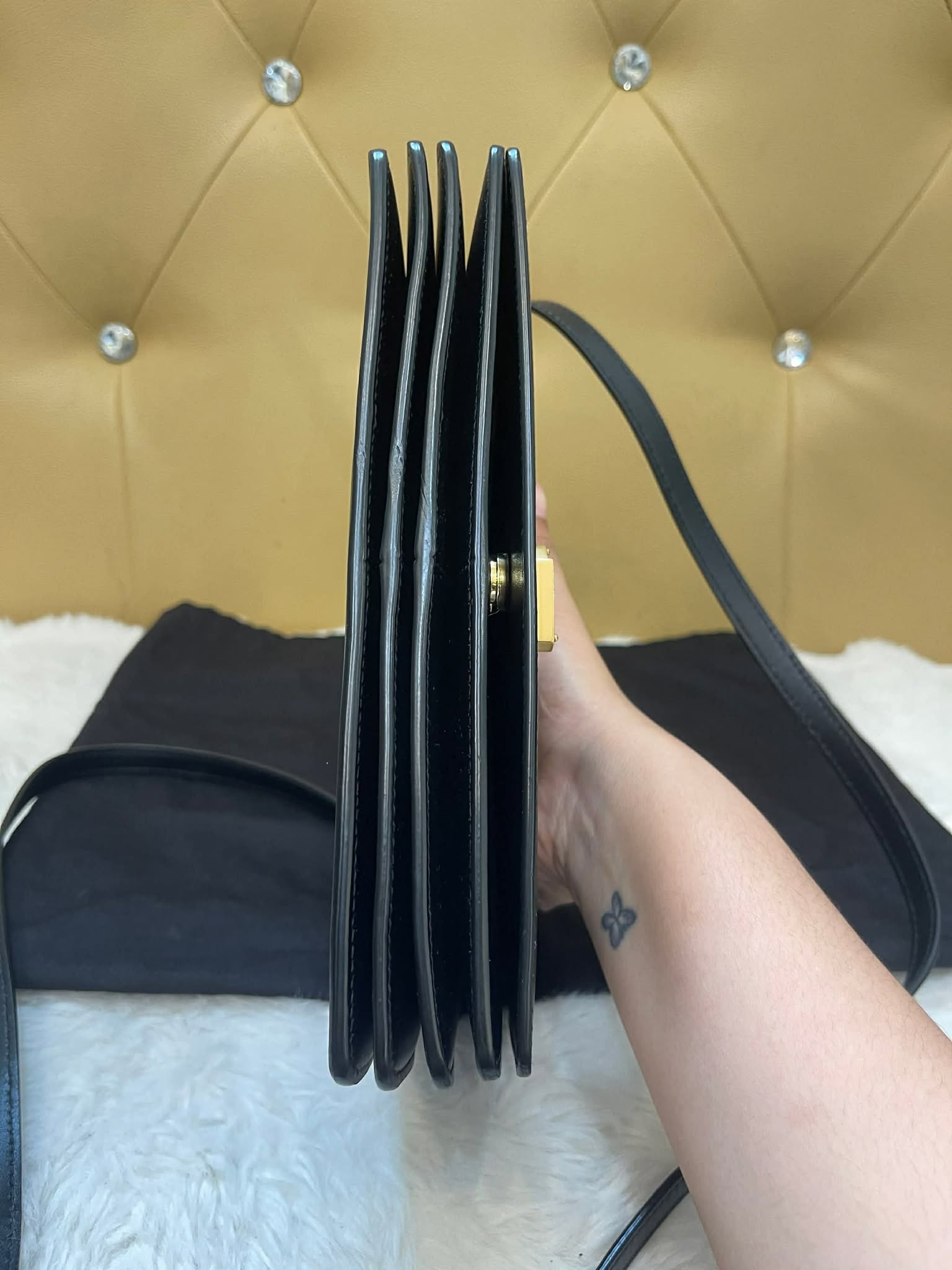 Hardware: Polished gold-tone.