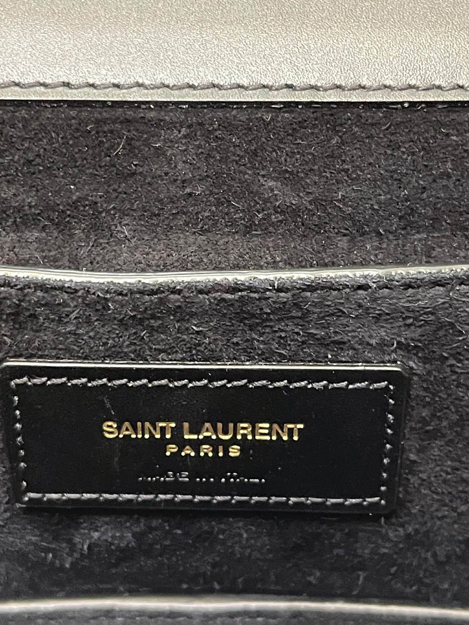Logo: Raised Cassandre YSL monogram in gold-tone.